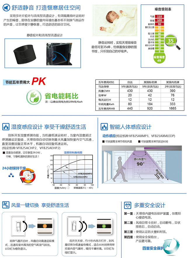 台达新一代高性能换气扇,凭借着集团多年来在无刷直流风扇和电源领域的技术优势,结合台达先进的生产制程,为消费者打造出了高品质、节能、静音的换气扇系列产品。实践企业“环保 节能 爱地球”的经营使命!
